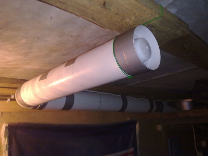Теперь рассмотрим особенности изготовления этой системы. Прежде всего вам необходимо подготовить 2 трубы. Диаметр труб выбирается исходя из площади погреба. Например, если она равна 8 м2, то труба может иметь Ø120 мм. Если труба будет только одна, то при той же площади ее диаметр должен быть большим, например, 150 мм. Но не забывайте, использовать одну трубу допускается только в маленьких погребах. Если решено использовать одну трубу, то в ней должно быть сразу 2 канала. На каждом из них будет своя заслонка, которая и осуществляет регулировку оттока и притока воздуха.