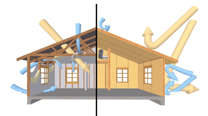 Стандартная вентиляция в доме из СИП- панелей работает по принципу естественной циркуляции. Теплый воздух улетучивается сквозь вытяжки. Однако вместе с загрязнениями из помещения уходит тепло. Такие системы увеличивают траты на отопление и могут стать причиной образования нежелательного конденсата.